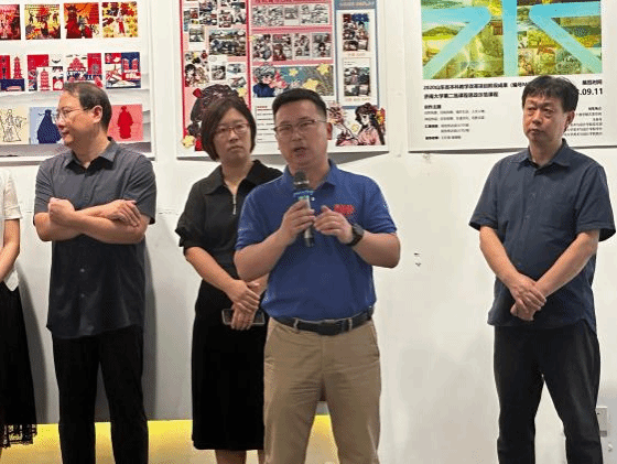 济南大学教务处张海鲲副处长致开幕词,对《插画设计》课程的教学成果给予充分的肯定,强调理论与实践教学相结合的重要性。尤其指出了课程思政在教学中的重要性,极大的肯定了授课教师王红梅将省级教学改革课题与课程汇报展出相结合,阶段性成果与多彩课题展示形式相结合的设计成果。