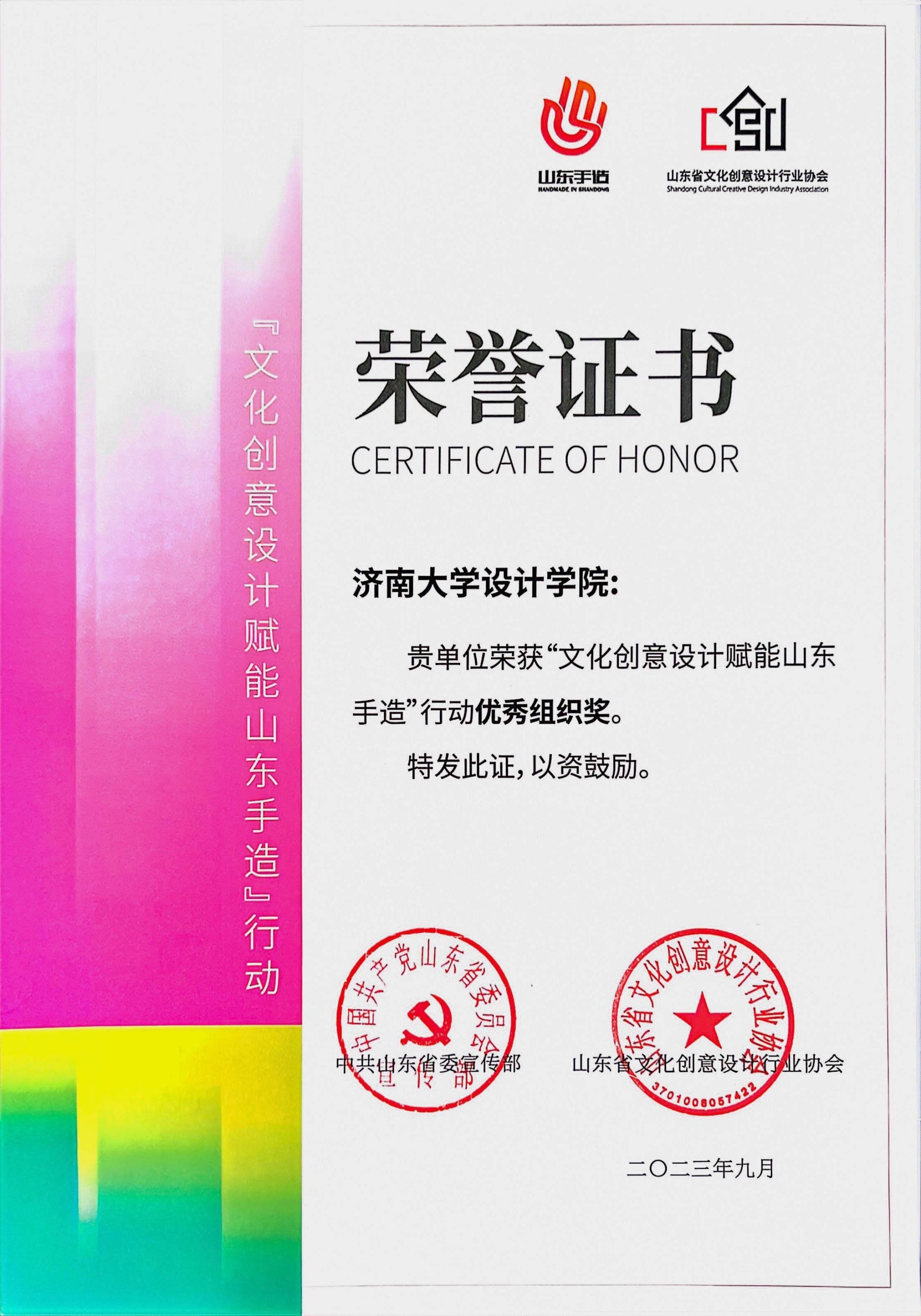 近日,由山东省委宣传部主办,山东省十六地市委宣传部和山东省文化创意设计行业协会共同承办的“文化创意设计赋能山东手造”行动赋能团队颁奖活动举行。我校437ccm必赢国际副院长杨海波所率团队深入各地非遗工作室、文创企业开展系列公益宣讲、专题培训、设计工坊并结合访企拓岗等活动,以其良好的各界反响获颁“优秀组织奖”。