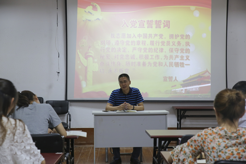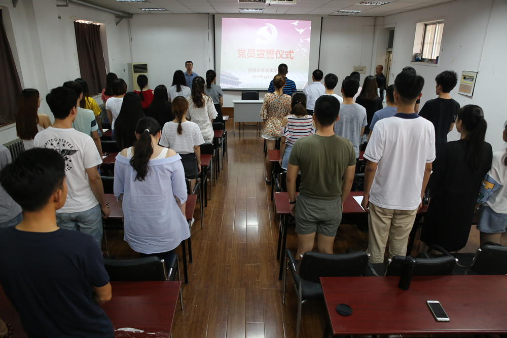 为隆重纪念中国共产党建党96周年,推进“两学一做”学习教育常态化制度化,进一步增强党组织的凝聚力和战斗力,引导广大党员坚定理想信念,增强党性意识,为实现“两个一百年”奋斗目标和中华民族伟大复兴的中国梦而努力奋斗,6月29日下午4点半在四教楼六楼大会议美术学院举行纪念中国共产党建党96周年暨新党员入党宣誓仪式。出席仪式的有美术学院党委书记夏卫东、党委副书记刘军、信苏珊老师、李健慧老师,以及美术学院学生支部全体党员。仪式由辅导员田涛老师主持。