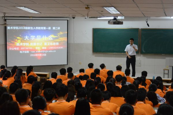 为使2018级新生更好的适应大学生活,做好大学规划,9月16日下午,美术学院于2教104举行新生第一课——大学是什么,学院党委书记夏卫东为新同学们作了入学教育报告。18级辅导员李健慧与18级全体新生共同参加了此次报告会。